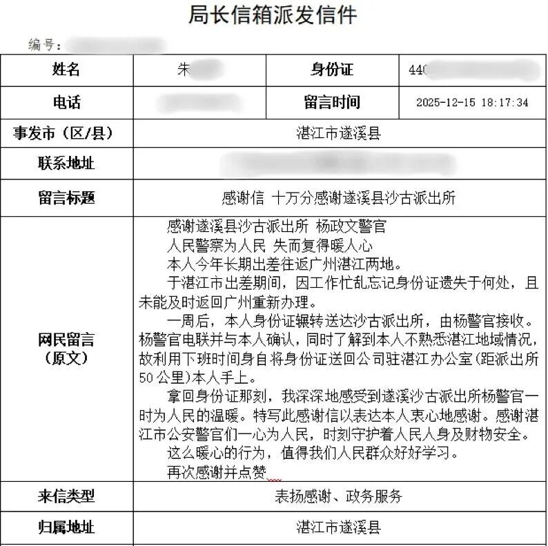 局长信箱 接诉即办丨失物上门送达!遂溪公安把实事办到群众心坎上