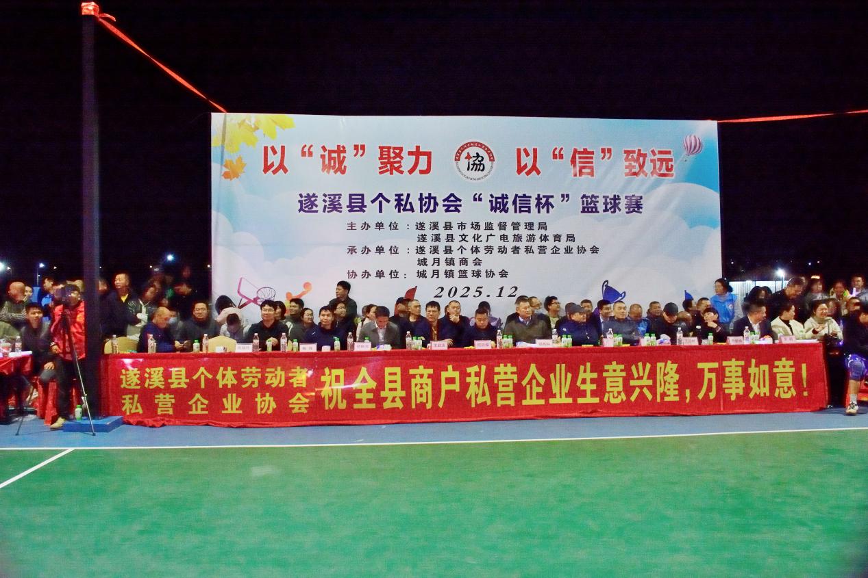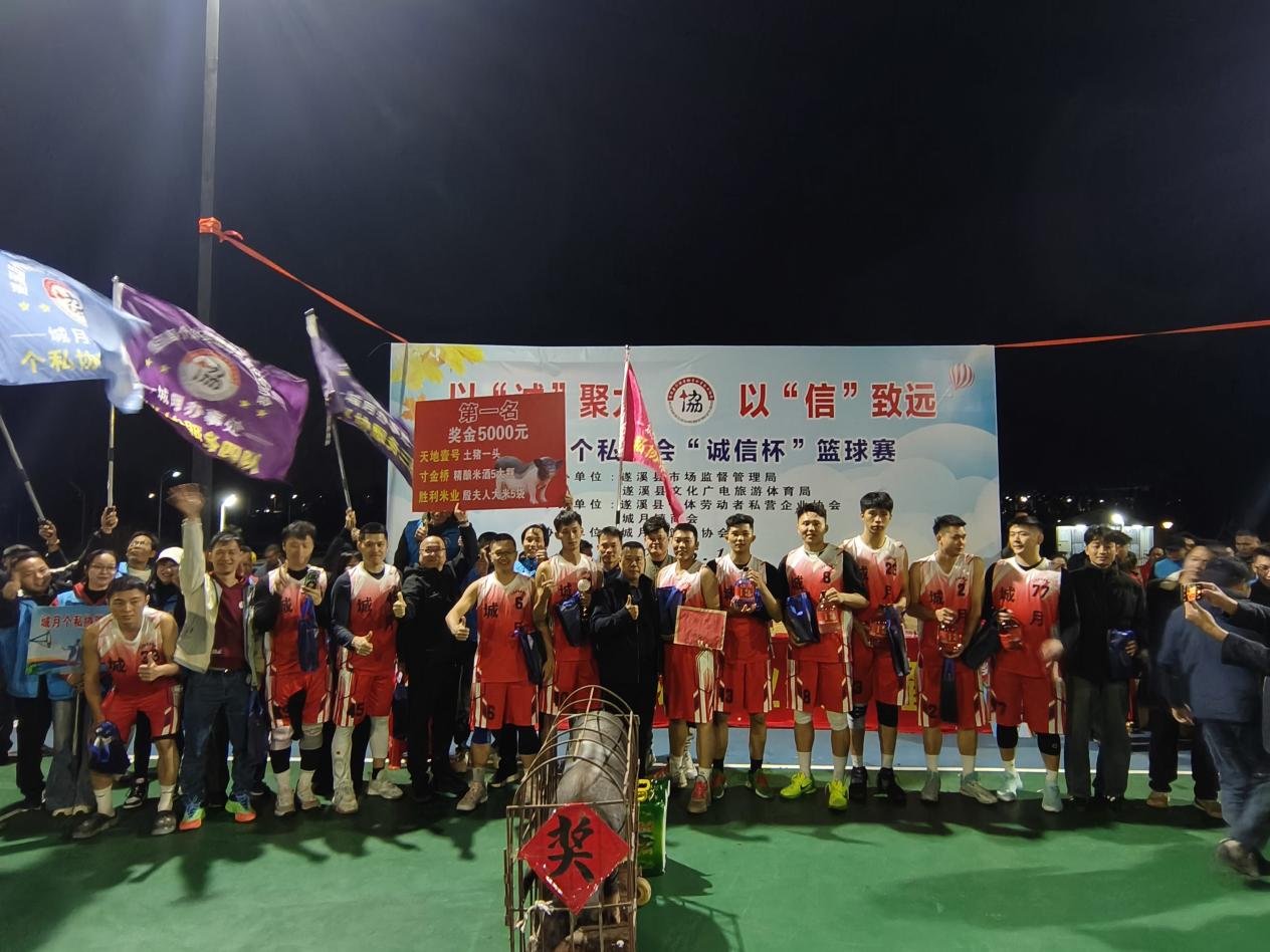 12月25日晚上,城月镇体育公园篮球场灯火通明、气氛热烈,由遂溪县市场监督管理局、遂溪县文化广电旅游体育局联合主办,遂溪县个体劳动者私营企业协会、城月镇商会承办,城月镇篮球协会协办的“诚信杯”篮球总决赛在此激情上演。经过激烈角逐,城月队脱颖而出,成功摘得桂冠。