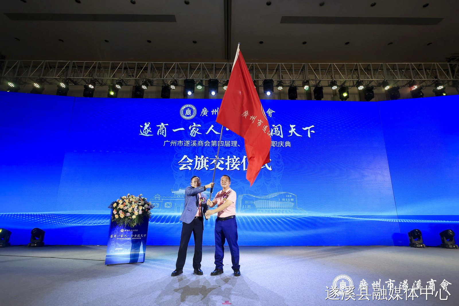 王晓春把商会会旗交到了第四届会长陆桂鸿手中,全场响起热烈的掌声,共同见证广州遂溪商会实现和谐、平稳的换届与传承。