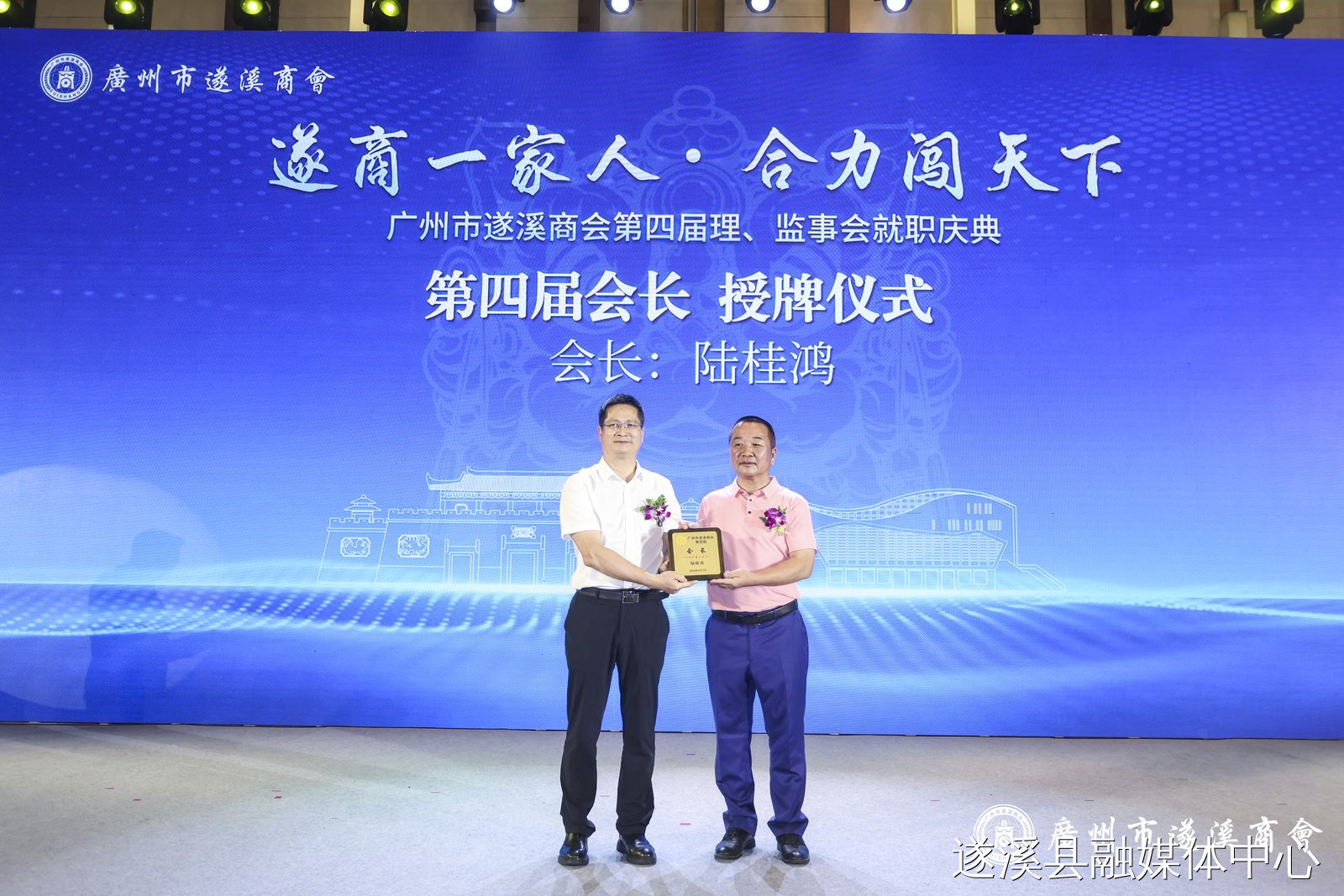 骆华庆、沈东宇、潘汝权等县领导分别为广州市遂溪商会第四届会长、名誉会长、创会会长、荣誉会长、监事长、轮值会长、秘书长、常务副会长、副会长、会员颁发牌匾证书。