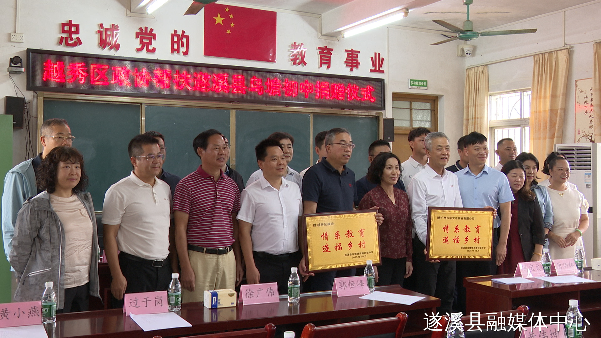 在乌塘中学,调研团深入察看校园教学设施,认真听取学校负责人关于办学情况和发展需求的汇报。随后向学校捐赠帮扶资金10万元用于学校围墙修缮,全力保障校园安全。乌塘中学向捐赠企业及越秀区政协回赠感谢牌匾。