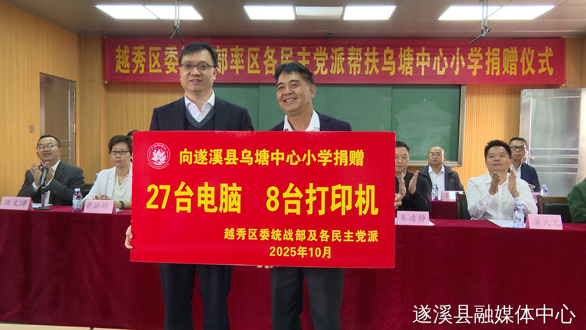捐赠仪式上,广州市越秀区委统战部联合区各民主党派向该校捐赠了电脑、打印机等教学设备。乌塘中心小学向越秀区委统战部及各民主党派代表回赠了牌匾和锦旗。