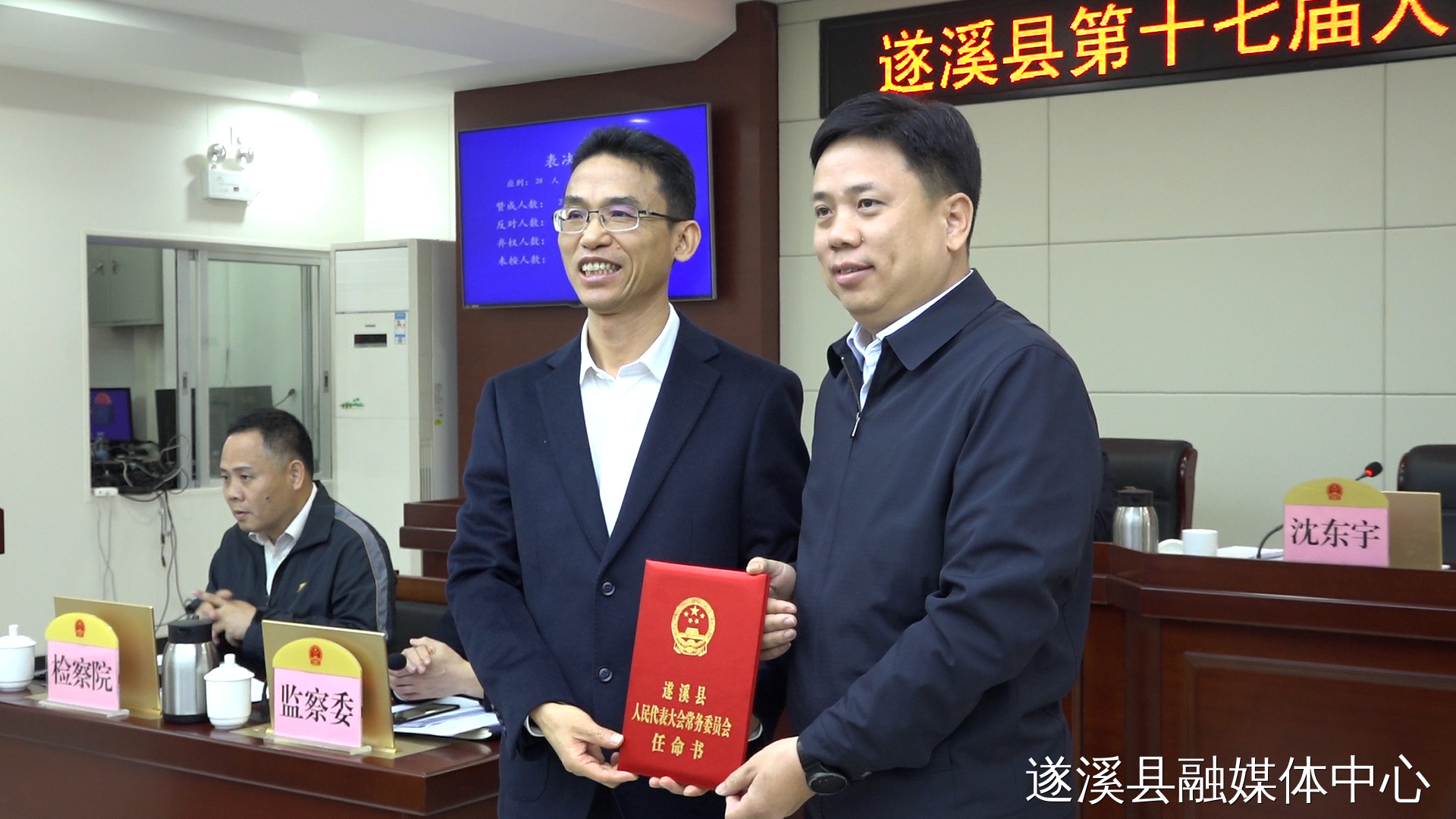 沈东宇为新任命的国家机关工作人员颁发任命书。新任命的国家机关工作人员进行了宪法宣誓。