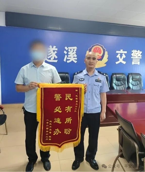 2025年5月12日,群众符先生专程来到交警大队,将一面印有“民有所盼 警必速办”锦旗送到民警手中。符先生对交警大队的高效行动和工作成效给予充分肯定。