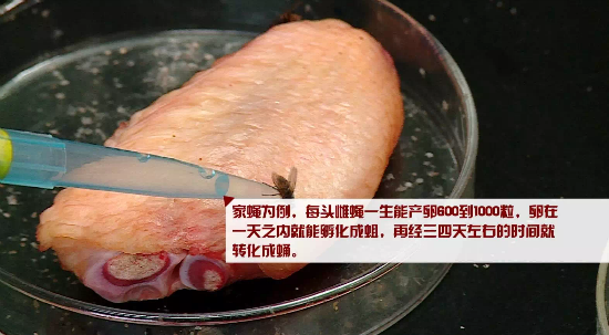 经过观察发现,在实验开始的30分钟内,几乎没有苍蝇盯热食物;30分钟后,热食物上慢慢有苍蝇盯上,到1小时,热食物和冷却的食物上的苍蝇几乎没差别。大头金蝇更偏爱生鲜食物,生鸡翅上马上爬满了密密麻麻的苍蝇,让人头皮发麻。