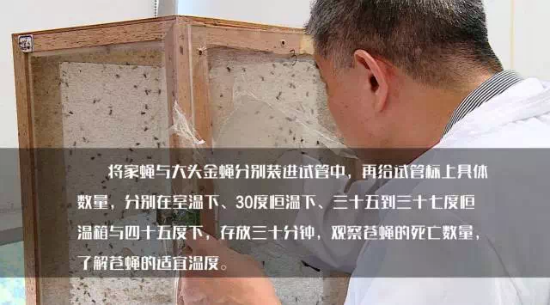 将家蝇与大头金蝇分别装进试管中,再给试管标上具体数量,放恒温箱或电热箱内,在室温(25℃)下、30℃恒温下、35-37℃恒温下、45℃下分别放30分钟,观察成蝇的死亡数量,了解苍蝇的适宜温度。